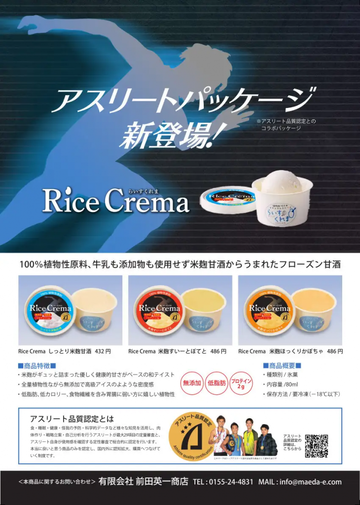 アスリート品質認定がコラボパッケージをリリース、北海道帯広市の前田英一商店が展開する100%植物性原料の新感覚フローズン甘酒「らいすくれま」